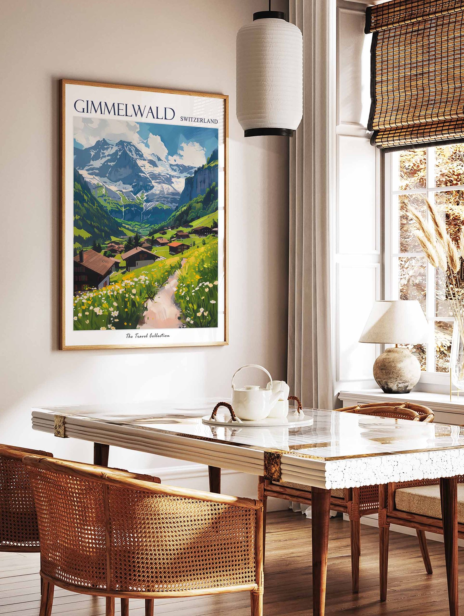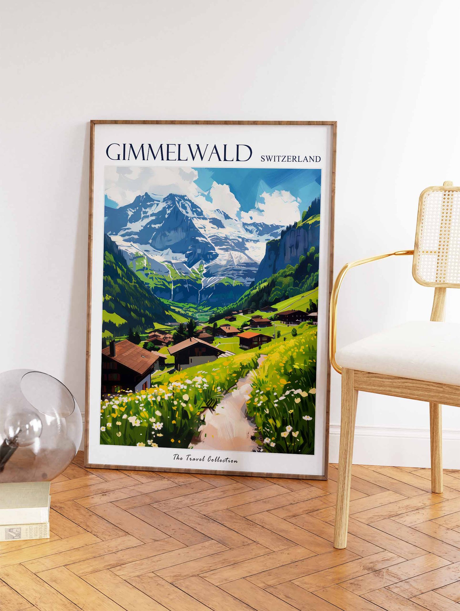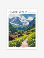 Escape to the idyllic Swiss Alps with this stunning travel poster. Perfect for home decor or a gift for the nature lover, this poster showcases the breathtaking beauty of Gimmelwald, including its charming village, towering mountains, and crystal-clear lakes.