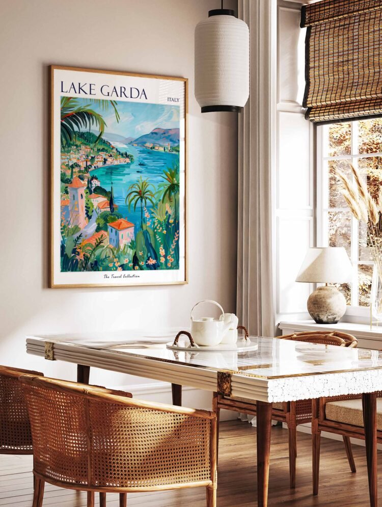 Discover the idyllic Italian lake of Garda with this stunning travel poster. Perfect for home decor or a gift for the nature lover, this poster showcases the lake’s breathtaking beauty, charming villages, and luxurious villas.