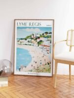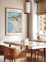Captivating Lyme Regis travel poster showcasing the Jurassic Coast’s historic harbor and fossil-rich cliffs, perfect for British seaside enthusiasts and coastal decor lovers wanting to bring English charm into their home or office space.