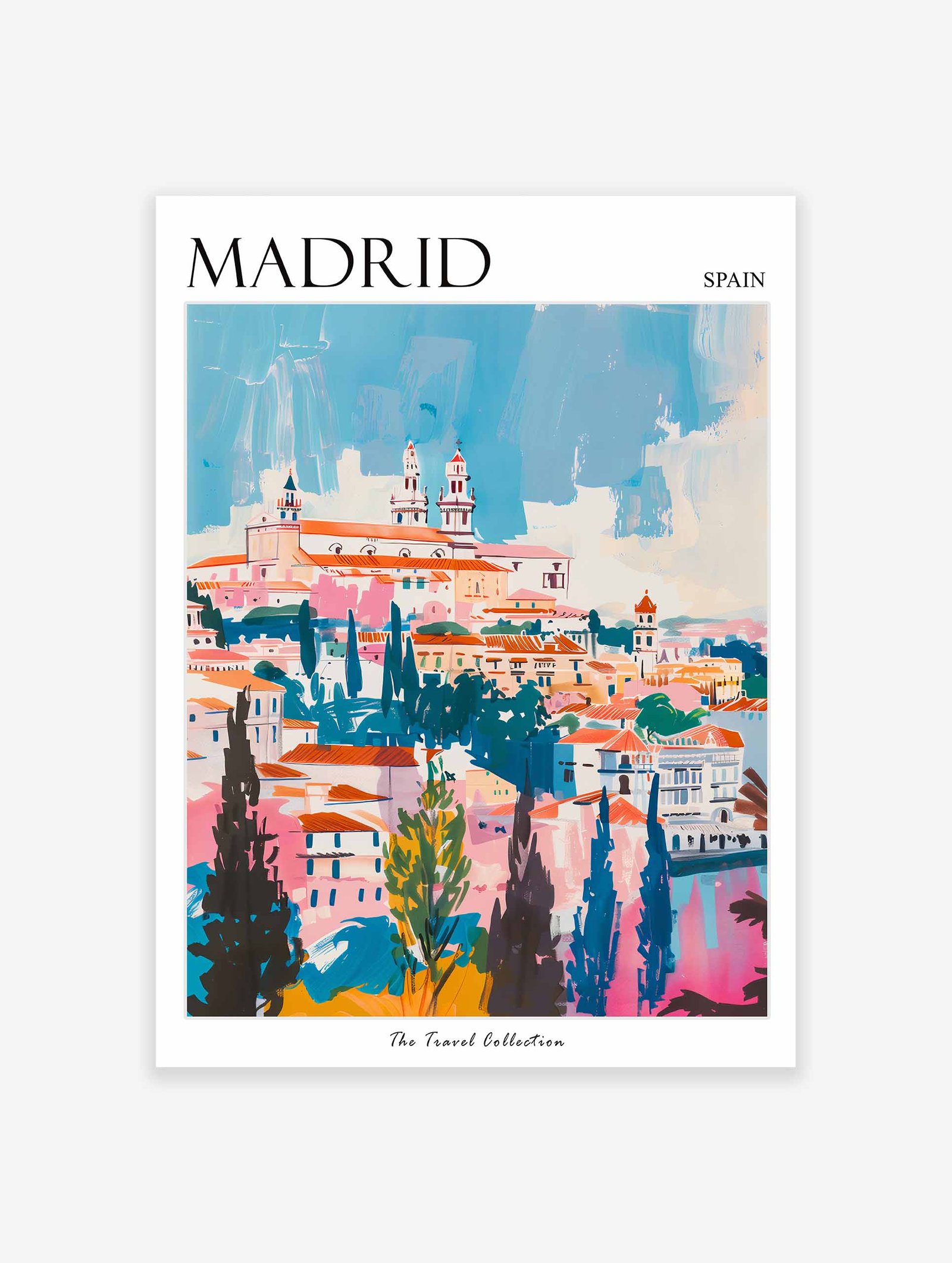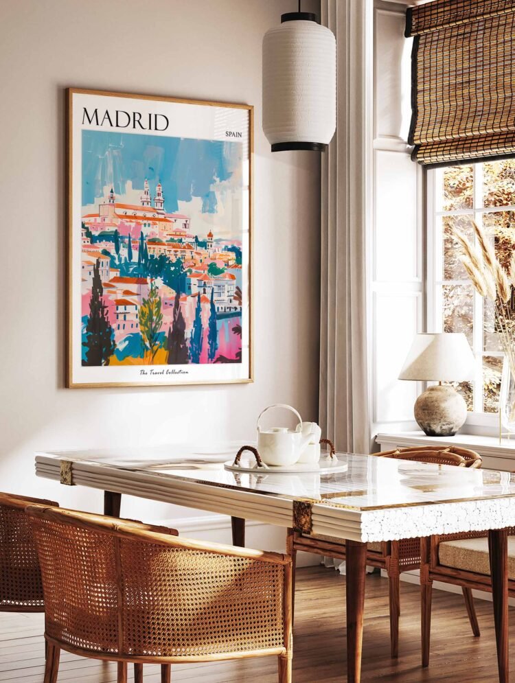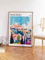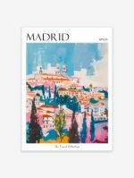 Stunning Madrid travel poster capturing Spain’s majestic capital with its grand boulevards and royal heritage, perfect for Spanish art enthusiasts and urban decor collectors seeking to bring Mediterranean elegance into their living space.