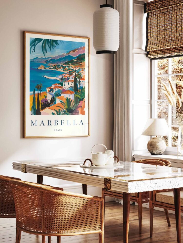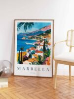 Escape to the sun-drenched glamor of Marbella with this captivating travel poster, showcasing the city’s stunning Mediterranean coastline, elegant promenades, and vibrant social scene. Infuse your space with a touch of Spanish sophistication and coastal charm with this versatile wall art piece.