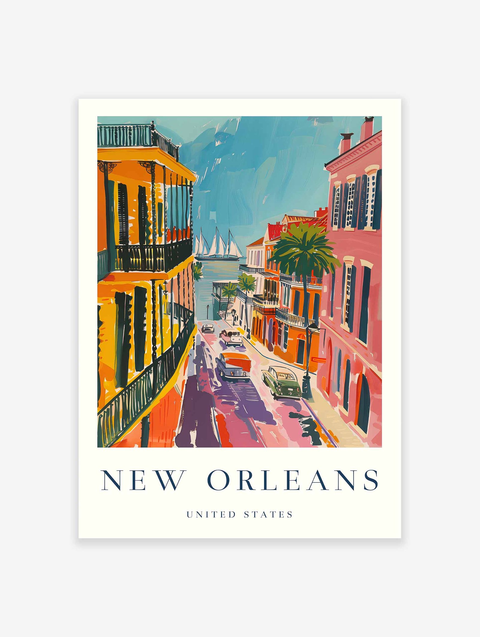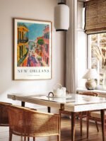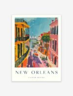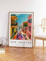 The New Orleans travel poster captures the vibrant spirit of this iconic city, showcasing its colorful architecture, lively music scene, and delicious cuisine. Perfect for music lovers, history buffs, and foodies alike, this poster is a stunning reminder of the Big Easy.