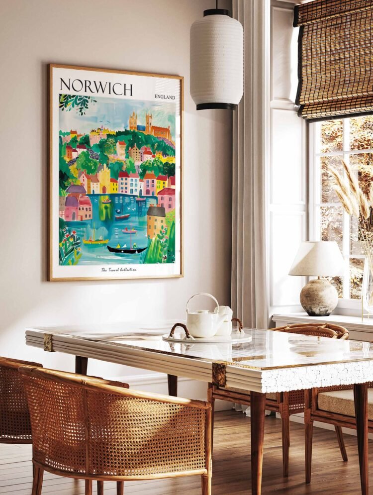 Journey to England’s most complete medieval city with this captivating Norwich travel poster, featuring the majestic cathedral, historic castle, and charming cobbled lanes of Norfolk’s beloved cultural capital. Perfect as English heritage wall art or historical home decor, this striking print captures the architectural splendor and timeless beauty of this ancient market city, bringing a piece of East Anglian history into your home.
