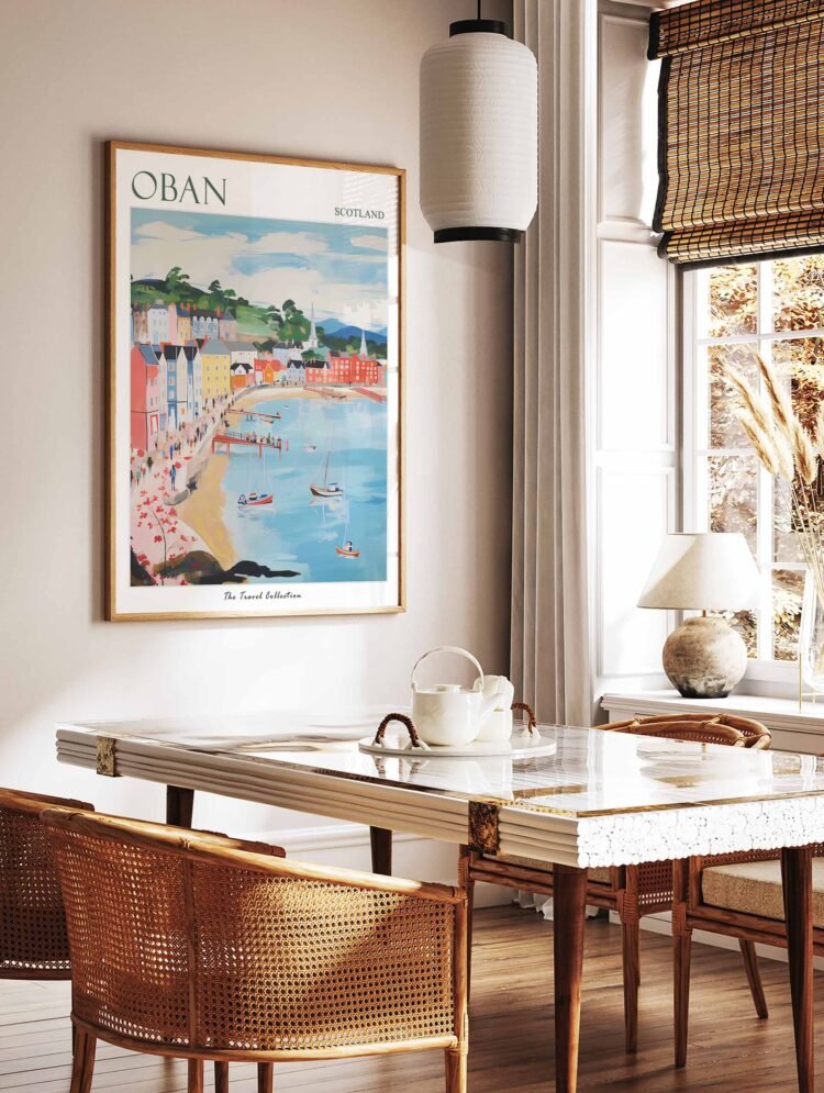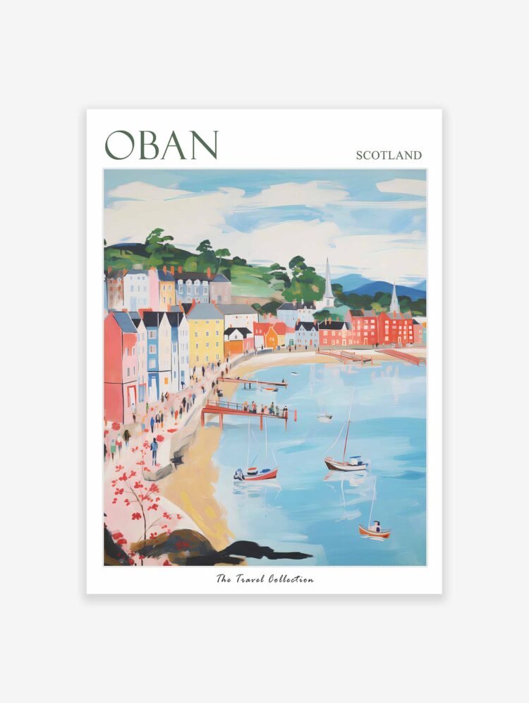 Explore Scotland’s Gateway to the Isles with this enchanting Oban travel poster, showcasing the picturesque harbor, historic distillery, and dramatic Highland scenery of this charming West Coast haven. Perfect as Scottish Highland wall art or coastal home decor, this striking print captures the romance of Scotland’s seafaring heritage and whisky culture, bringing the magic of the Western Highlands into your space.