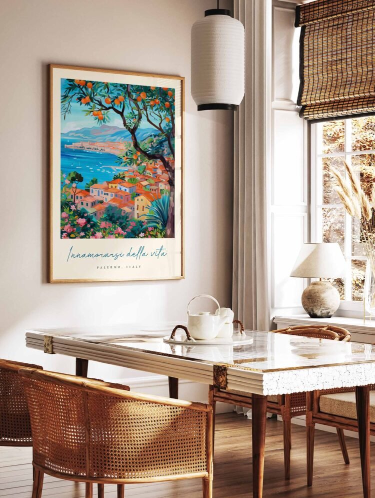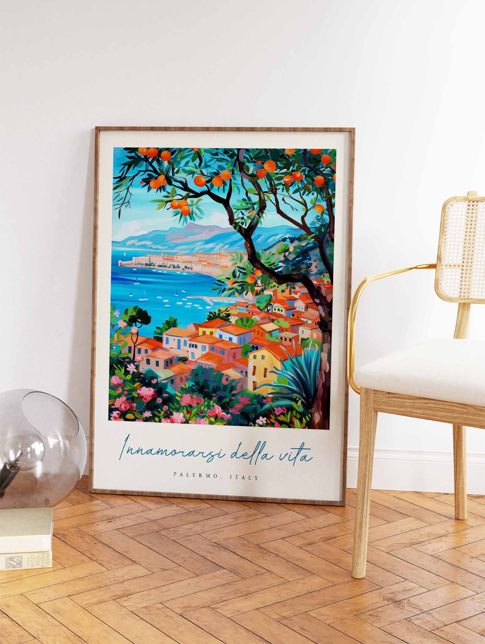 Experience Sicily’s vibrant capital with this stunning Palermo travel poster, showcasing the city’s Norman palaces, baroque churches, and bustling street markets that embody Mediterranean cultural heritage. Perfect as Italian wall art or Mediterranean home decor, this striking print captures the essence of Sicily’s most dynamic city, bringing the warmth and romance of southern Italian architecture and culture into your living space.