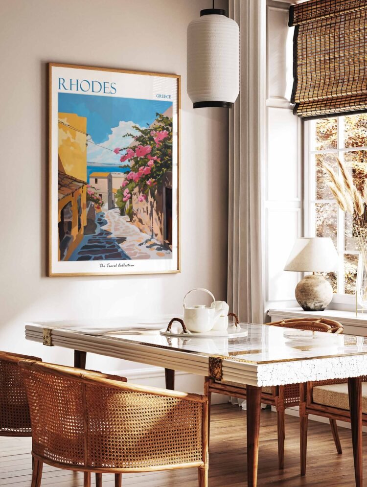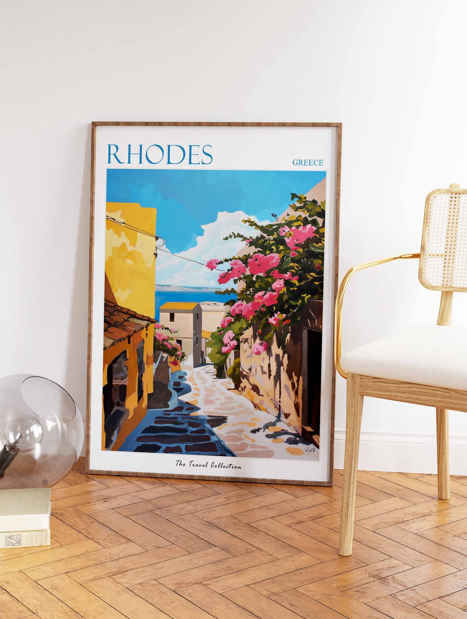 The Rhodes travel poster captures the sun-kissed beauty of this Greek island, showcasing its stunning beaches, ancient ruins, and vibrant nightlife. Perfect for beach lovers, history buffs, and partygoers alike, this poster is a stunning reminder of the Greek islands’ allure.
