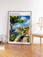 The Rhodes travel poster captures the sun-kissed beauty of this Greek island, showcasing its stunning beaches, ancient ruins, and vibrant nightlife. Perfect for beach lovers, history buffs, and partygoers alike, this poster is a stunning reminder of the Greek islands’ allure.