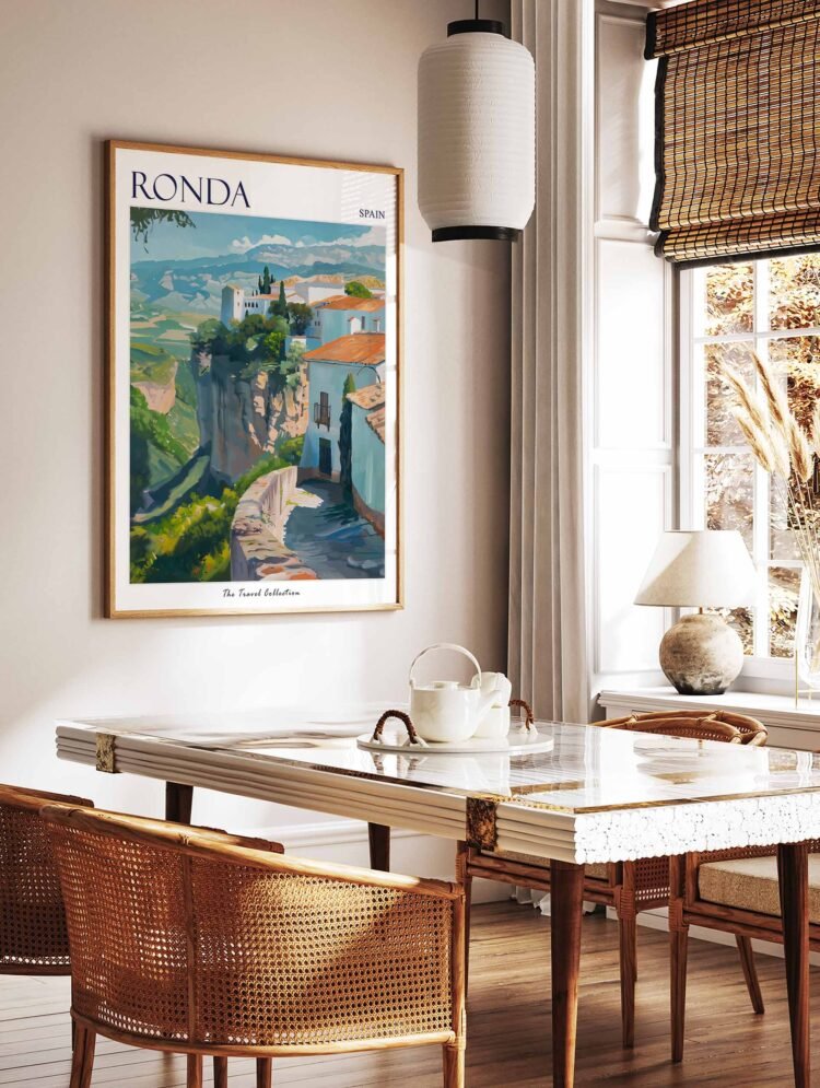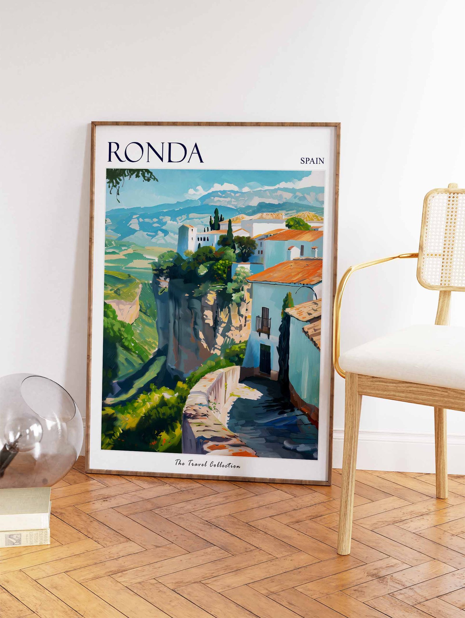 The Ronda travel poster captures the dramatic beauty and rich history of this Andalusian town, showcasing its iconic bridge and stunning landscapes. Perfect for history buffs, culture enthusiasts, and anyone seeking a romantic escape, this poster is a stunning reminder of Spain’s allure.
