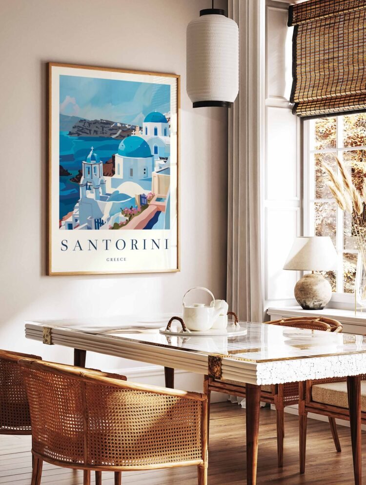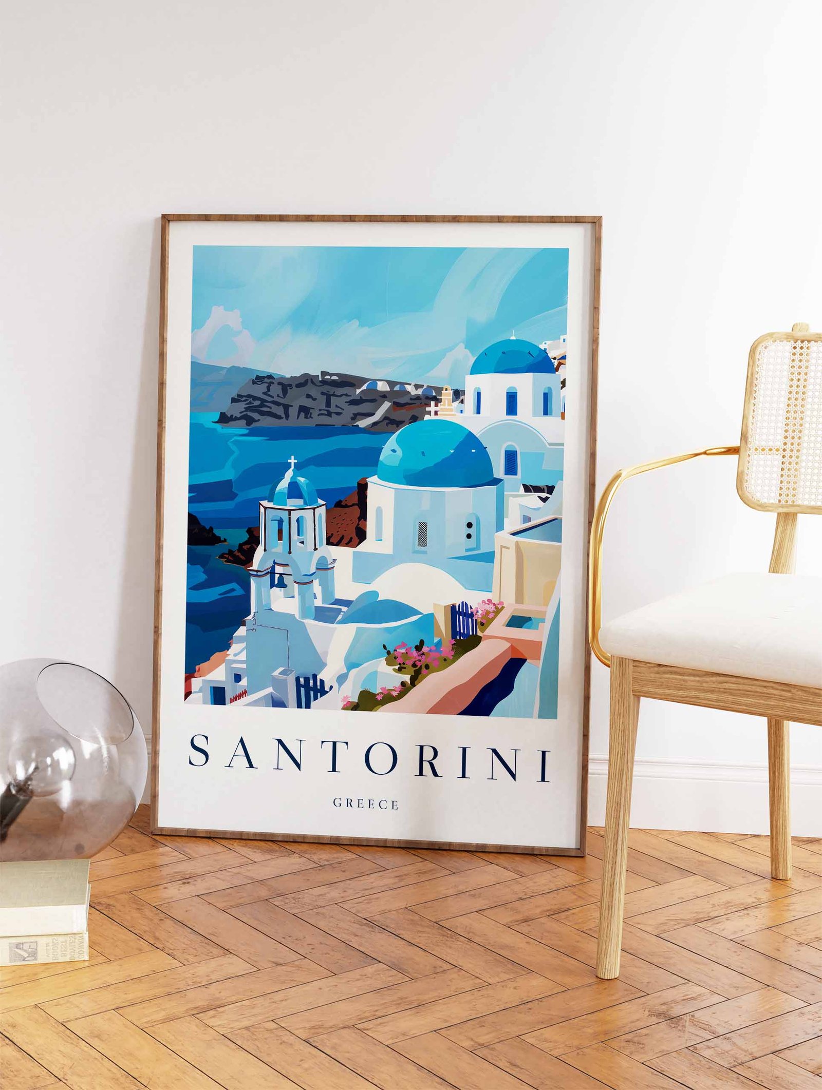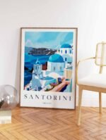 Experience the mesmerizing allure of sun-bleached cliffs and azure domes with this wanderlust-inspiring Santorini travel poster, perfect for transforming any room into a Mediterranean escape.