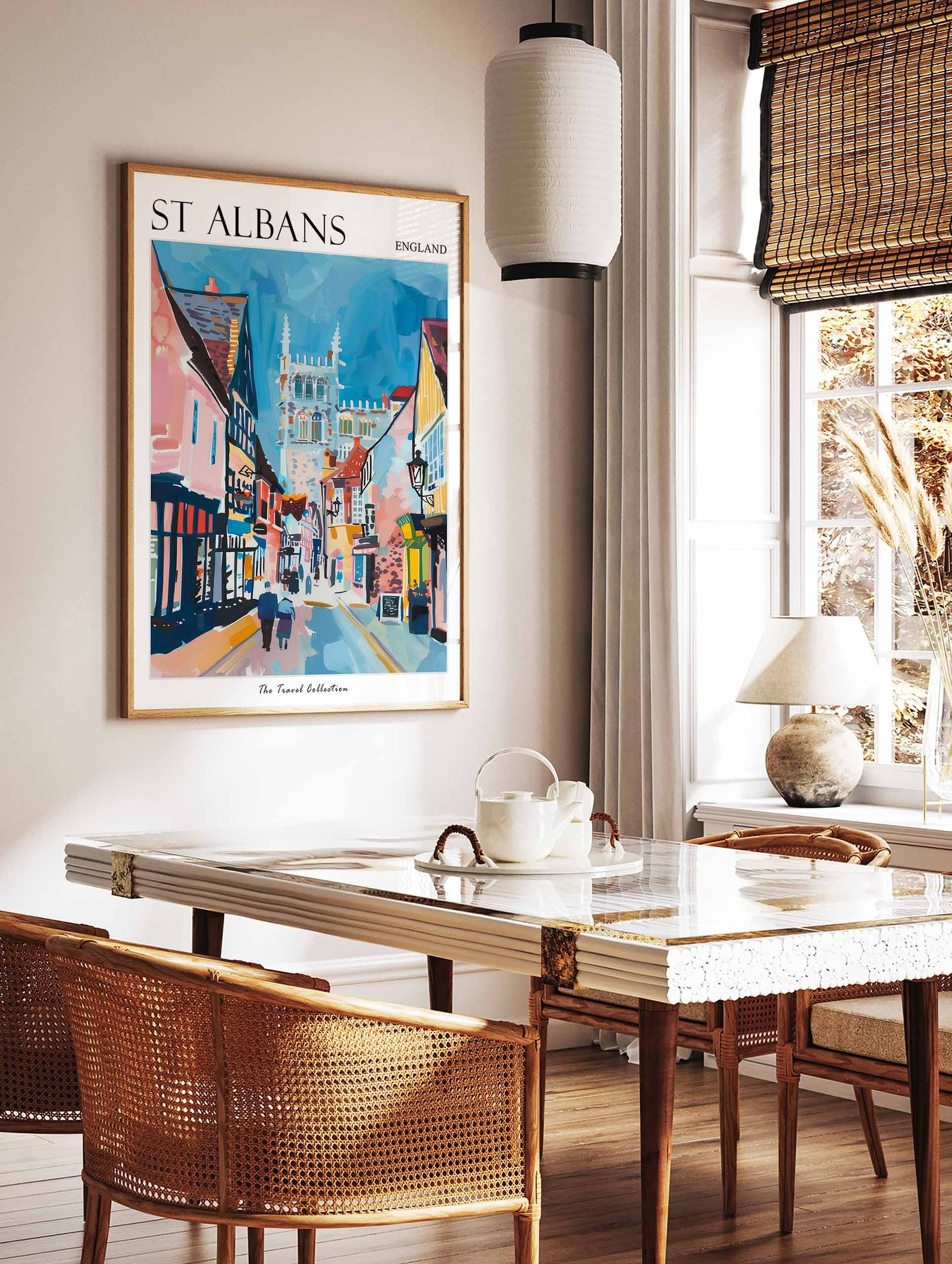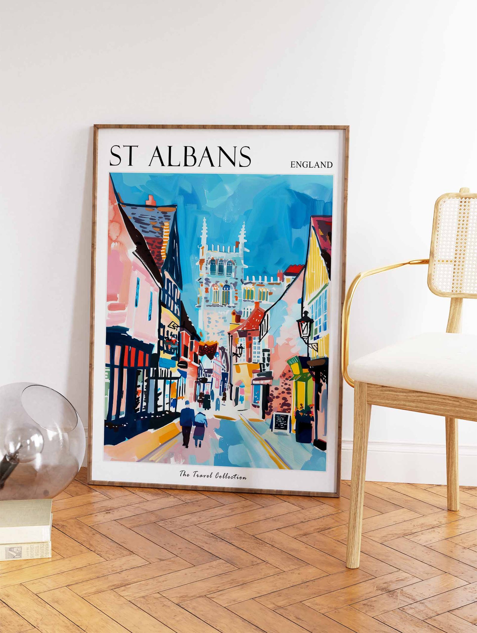 The St. Albans travel poster captures the historic charm and picturesque beauty of this English city. With its stunning cathedral, Roman ruins, and quaint streets, this poster is perfect for history buffs, culture enthusiasts, and anyone seeking a peaceful escape.